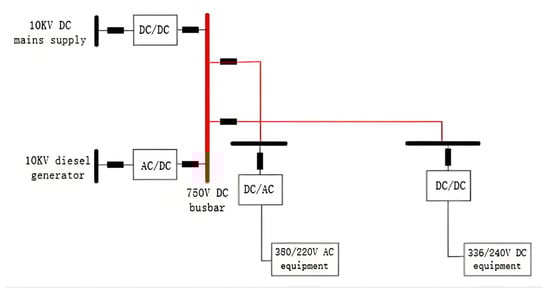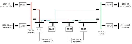 The traditional data center solution is to provide a medium-voltage AC distribution circuit (typically 10 kV or 20 kV, from various 110 kV stations or bus sections) of sufficient capacity through the existing AC distribution system [19,20]. When DC supply is introduced, direct DC can be taken into account from the medium-voltage 10 kV incoming source down to the low-voltage distribution section close to the end loads. With the introduction of DC transmission and distribution, access to green energy becomes more straightforward. Photovoltaics, large-scale energy storage batteries, and future backup hydrogen fuel cells are all DC output interfaces [21]. From an electrical point of view, the access to the above systems, in addition to their DC interfaces, offers significant advantages in terms of system harmonics over traditional AC solutions.