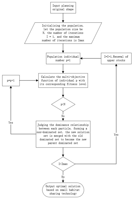 Firstly, the initial population of size N is randomly generated, and the first generation of offspring population is obtained through the three basic operations of selection, crossover, and mutation of the genetic algorithm; secondly, the parent and offspring populations are combined from the second generation onwards to carry out the fast non-dominated ordering, and at the same time, the crowding degree of each individual in the non-dominated layer is computed, and the suitable individuals are selected according to non-dominated relationship and crowding degree of individuals to form the new offspring population; finally, a new offspring population is generated through the basic operation of a genetic algorithm. This continues until the conditions for the end of the procedure are met. The planning and solving process is shown is Figure 6 and as follows: