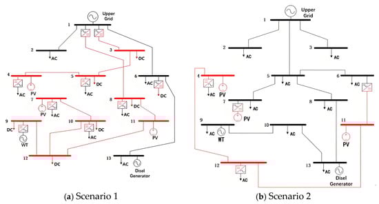 In Scenario 1, due to the presence of a large number of DC loads in the data center, the DC component occupies a major part of the distribution network topology. In this case, the buses with DC loads or new energy units have a better chance of being selected as DC buses, such as bus 3, bus 11, and bus 12, and the buses with AC loads or new energy units have a better chance of being selected as AC buses, such as bus 2 and bus 13, because it can save the investment cost of the converter and reduce the loss of the converter; there are AC and DC components in the buses, and the selection of the bus type depends on the ratio of AC and DC components in the buses, the topology of the distribution network, and so on.