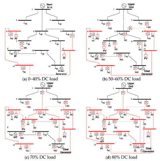 To demonstrate the process of distribution network morphology evolution, this section designs a successive evolutionary arithmetic example of the optimal topology morphology of the distribution network under the scenario of continuous penetration of DC loads in a data center based on single-stage planning, with 0% DC load penetration of the data center as described in the initial scenario, assuming 15 years for each planning cycle, and a 10% growth in DC load penetration for each planning cycle. The results of the arithmetic example show that the optimal topological network frames derived for data center DC load penetration rates of 0%, 10%, 20%, 30%, and 40% are shown in Figure 8a. When the penetration rates are 50% and 60%, the optimal topological network frames derived are shown in Figure 8b, when the penetration rate reaches 70%, the optimal topological network frames derived are shown in Figure 8c, and when the penetration rate reaches 80%, the resulting optimal topological mesh is shown in Figure 8d.