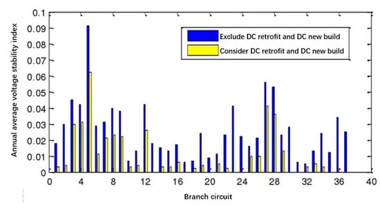 Figure 11 shows a comparison of the annual average voltage stability indicators for each branch for the planning schemes with or without considering DC reconstruction and DC new construction.
