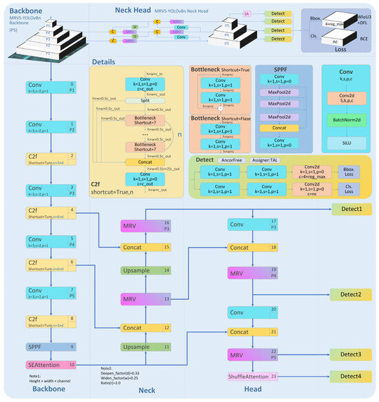 Since its introduction in 2023, YOLOv8 has emerged as the predominant algorithm in the domain of target detection, attributed to its lightweight architecture and rapid single-target detection capabilities, which have found applications across a wide range of scenarios [28]. In consideration of the particular requirements and implications associated with deep-sea pipeline inspection tasks, this research focuses on optimizing the YOLOv8 model. The enhanced MRVS-YOLOv8n network architecture, illustrated in Figure 1, incorporates SEAttenion into the backbone network, substitutes the C2f module in the neck network with the MRV module, introduces the ShuffleAttention model prior to the third detection head to add an additional detection head, and employs the WIoU3 loss function in lieu of the Clou loss function.