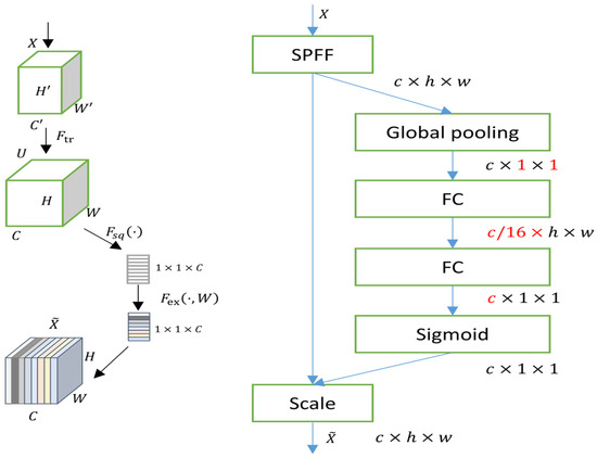 The SE module is an attentional mechanism for enhancing feature representation in deep learning. Originally proposed by Hu et al. in 2017, it focuses on the relationship between channels and adaptively recalibrates the channel feature response by explicitly modeling the interdependencies between channels [32]. There are three main SEAttention operations: Squeeze operation, Excitation operation, and Reweight operation. The specific steps are as follows: The SE module first performs Global pooling on the output feature map of the convolutional layer to compress the spatial information of each channel into a single value so as to obtain a global feature at the channel level. Then, two fully connected layers (FC layer) are used to nonlinear transform the compressed features to learn the importance weights of different channels. The first FC layer reduces the dimension, and the second FC layer restores the dimension and normalizes the weight to between 0 and 1 using the Sigmoid activation function. Finally, the learned channel attention weight is multiplied by the original feature map channel by channel, thereby reinforcing important features and suppressing unimportant features. Its basic structure and its dimension transformation are shown in Figure 2.