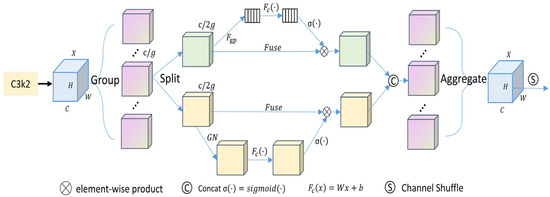 Shuffle Attention structure diagram. Note: g represents the number of groups in which channels (c) are divided, Fgp is a global average pooling operation, GN is the Group Norm operation, and aggregate is used to aggregate the features of different branches.