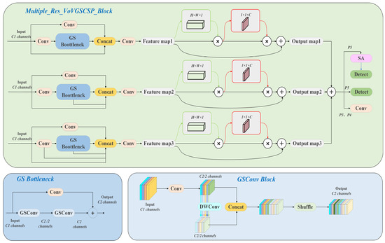 Proposed by VoVGSCSP in 2024, the module provides a more flexible and efficient architectural design, especially when dealing with multi-scale objects and complex scenes. Because this architecture can efficiently transmit feature information, and through the introduction of overlapping visual modeling, the model has a more accurate grasp of the details of the object and a stronger robustness [34]. VoVGSCSP provides good support for real-time object detection by improving the efficiency of convolution operation and reducing the complexity of network computation, especially in scenarios with high precision requirements and limited computing resources. For example, VoVGSCSP1 is defined as follows: