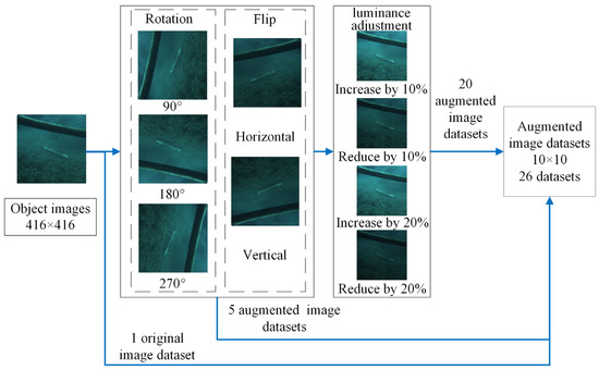 The image data set is divided into 6396 training sets and 1575 test sets according to the ratio of 8:2, and the training set is also divided into the training set and the verification set according to the ratio of 8:2, all of which are 416×416 pixels in size and are RGB images, including 127,696 targets. The details are shown in Table 1. First of all, all images continue to be label-read, and the pipes of concern are stored in xml format files. In order to expand the image to ensure training convergence and high precision of the model, the data enhancement method was used to expand the training set to 26 times the original, that is, the training set of 166,296 pieces (as shown in Figure 6, including three Angle rotation, horizontal flip, vertical flip, and four brightness adjustments). At the same time, since the image labels will change after rotation and flipping, the image rotation matrix is used to process the four corner points of each target for the rotated image, and the difference in the width is used to process the coordinates for the horizontally flipped image to ensure that the image corresponds to the label one by one.