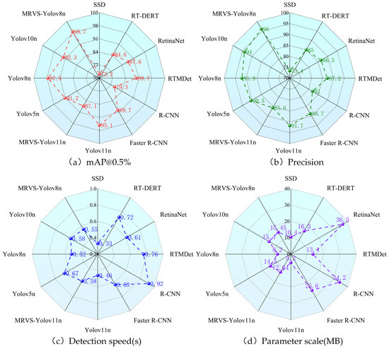 In order to verify the detection performance of the MRVS-YOLOv8n model, comparative experiments were carried out, respectively, compared with the mainstream target detection model. All experiments were carried out under the same setting. Yolo5-8-10 all used the n series, using average accuracy (mAP@0.5), accuracy, detection speed (s), and the number of parameters of each model to evaluate the detection accuracy, speed, and mass size of the model. See Figure 7 for detailed results.