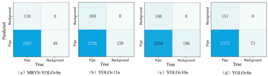 Figure 8 shows the confusion matrix of the YOLOvn series, in which the rows represent the real labels, the columns represent the prediction labels, and the numbers in the columns indicate the predicted quantity. Comparing the results of the six YOLO models, it can be found that the four models can predict the pipeline more accurately, but each model has certain false detection and missing detection situations. For example, the YOLOv11n model misdetected 126 backgrounds as pipes and 169 pipes were not detected. This situation is better improved in the MRVS-YOLOv8n model, where the number of false detections is 49 and the number of missed detections is 110. It is proved that MRVS-YOLOv8n can greatly improve the performance of deep-sea pipeline target detection.