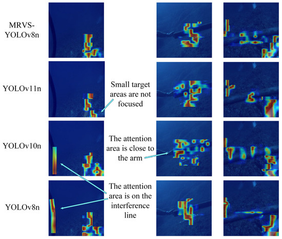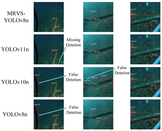 Further, Figure 9 presents the actual test results for each model, highlighting three outcomes with varying degrees of brightness and blurriness for comparative analysis. From the figure, it is evident that in scenarios where the brightness in the first column is low—resulting in a fuzzy image accompanied by bending interference lines—YOLOv8n and YOLOv10n misidentify these background interference lines as pipelines. In contrast, both YOLOv11n and MRVS-YOLOv8n successfully identify small target pipelines. As brightness increases and images become clearer, there is a marked reduction in instances of false detections and missed detections observed in columns two and three. Nevertheless, within the detection results presented in column two, YOLOv10n’s accuracy in detecting pipes mistakenly detected the arm as a pipe. Conversely, MRVS-YOLOv8n achieves flawless detection performance under similar conditions. This indicates that our proposed model can reliably identify targets and ascertain their positions even when faced with challenges such as color shifts inherent to deep-sea imagery, along with low brightness levels, image blurriness, and significant interference.