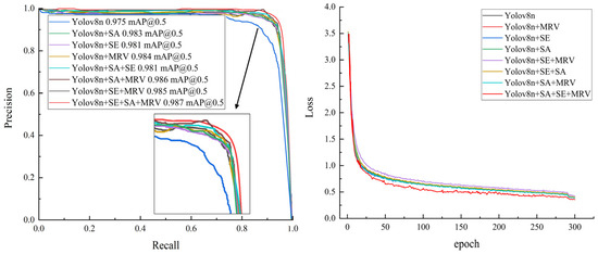 In order to evaluate the influence of SEAttention, ShuffleAttention, and MRV on the detection performance of MRVS-YOLOv8n, an ablation experiment was conducted in this paper, and the specific results are shown in Table 4. In Table 4, SE, SA, and MRV represent the SEAttention module, ShuffleAttention module, and MRV module, respectively. The results of the ablation experiment show that when only the SEAttention module is introduced, mAP@0.5 is improved by 0.2%, the accuracy is improved by 2%, and the detection speed is still 0.51s. The SE improves the accuracy while maintaining the same speed. After adding the SA module alone, mAP@0.5 increased by 0.8%. After adding the MRV module only, mAP@0.5 reaches 98.4%. Finally, compared with the original YOLOv8n, the MRVS-YOLOv8n algorithm with all the improved methods, mAP@0.5 increased by 1.2 percentage points, Precision increased by 2 percentage points, model parameter scale increased by 3.99 MB, and detection time slightly increased by 0.04 s. A series of ablation experiments demonstrated the effectiveness of each module and proved that MRVS-YOLOv8n was the most suitable model in this study. In order to clearly demonstrate the performance of each ablation model in deep-sea pipeline inspection, this paper uses Recall as the abscissa, Precision as the ordinate, epoch as the abscissa, and mAP@0.5% as the ordinate. The curves of different ablation models are shown in Figure 11.
