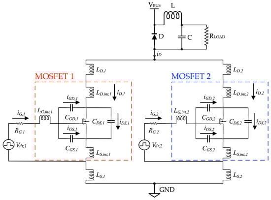 Equivalent circuit of two paralleled SiC MOSFETs, integrated with a DC–DC buck converter, during transients.