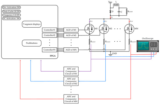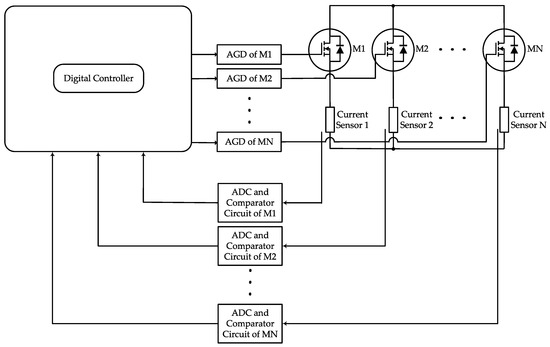 The proposed balancing solution can be extended for connecting multiple devices in parallel. The extended design of the proposed technique, connecting in parallel N devices, is depicted in Figure 28. To extend the proposed self-sustaining technique for multiple power devices, an active gate driver, a current sensor (Rsense), an ADC and a comparator circuit are mandatory for each SiC MOSFET. Moreover, the algorithm should be adjusted to receive more than two parallel currents and time delays. Also, the algorithm should drive more than two SiC MOSFETs and adjust their control parameters.