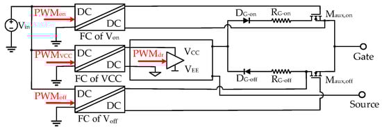 Each of the two gate sub-branches includes one resistor (RG-on and RG-off) and an auxiliary low-cost MOSFET (Maux,on and Maux,off), connected in series, as depicted in Figure 5. Maux,on and Maux,off serve as variable resistors controlled by voltage because the RDS-on of a MOSFET is controlled by its VGS. As a result, the total resistance (Ron and Roff) of each sub-branch can be controlled through the variation in the corresponding VGS, affecting td(on) and td(off) as well as the current slope. The charging gate current is controlled by the upper sub-branch while the discharging one is variated by the lower sub-branch. The cost-effective ultra-fast diodes DG-on and DG-off, which are connected in series with the components of the upper and lower sub-branch, respectively, are used to independently adjust the gate currents. Two additional forward converters are utilized to control the gate-source voltages of Maux,on and Maux,off. The output voltages of the forward converters depend on the duty cycles of the PWMon and PWMoff signals. Each paralleled SiC MOSFET requires four different driving pulses while the duty cycles of all PWM signals are generated and controlled by the digital controller. It is concluded that the proposed gate network turns the sub-branches into gate current sources controlled by voltage.
