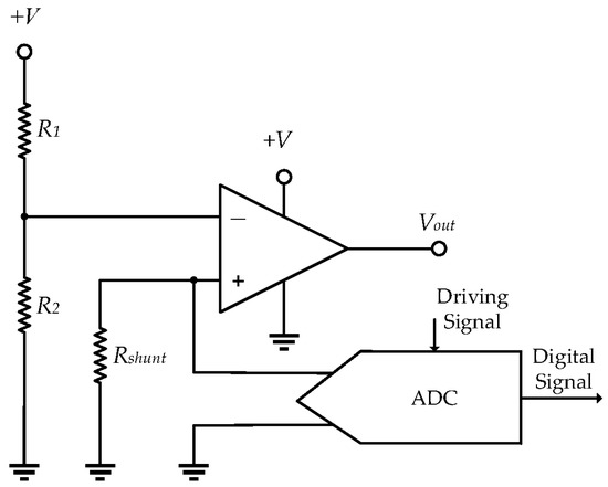 Time delays during each drain current’s turn-on and -off intervals are necessary for the proposed method’s implementation in order to estimate their differences. For this reason, a comparator circuit with the aid of an operational amplifier is used to capture the turn-on and -off time delays of each parallel current, as shown in Figure 6. R1 and R2 are the resistances of a voltage divider to regulate the voltage in which the output voltage (Vout) of the comparator turns high. +V is the voltage supply of the operational amplifier. Finally, Vout leads to the digital controller.