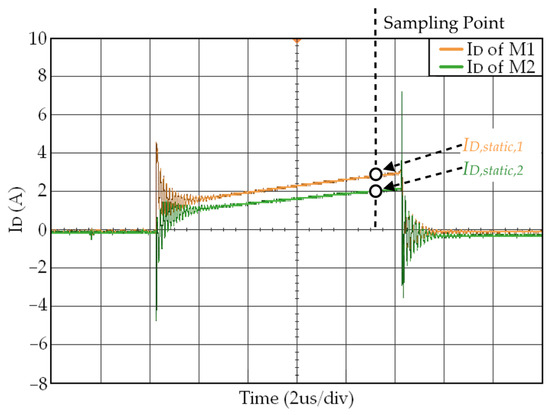 To calculate all current imbalances, the drain currents are sampled by the digital controller during specific time areas/points of the period. Static current imbalance is present only during the conduction stage. With the variation in VGS, the static current imbalance is suppressed during the entire conduction state of power switches. To estimate static current imbalance, the parallel currents should be captured at the sampling point (ΙD,static) exclusively during the conduction stage and not close to the transients where currents present a level of ringing, as illustrated in Figure 7.