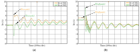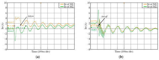 Current sharing between SiC MOSFETs during transient intervals is influenced by device parameter mismatch and deviation in parasitic elements due to power circuit asymmetry, leading to dynamic current imbalance. Based on Equation (1), the turn-on delay (td(on)) is affected by technical parameters. Consequently, transient current distribution during the turn-on interval is dependent on the mismatch of device parameters between paralleled SiC MOSFETs, since td(on) is differentiated, causing transient current imbalance [16]. The same applies to the turn-off delay (td(off)) of the power switch.