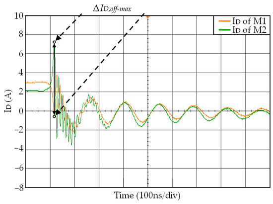As shown in Figure 8, the transient current imbalances are estimated by sampling each power device’s peak current during turn-on (ΙD,on-peak) and -off (ΙD,off-peak) intervals. Moreover, during the turn-off stage, the controller calculates the maximum difference between SiC MOSFET currents (ΔΙD,off-max), as shown in Figure 9.