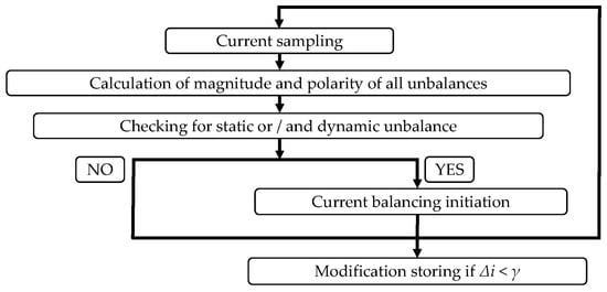Regardless of the current balancing method, the digital controller generates the PWM signals with the ability to control the duty cycle and switching frequency. Moreover, the digital controller drives the forward converters with three PWMs with a predefined frequency. As shown in Figure 11, the digital controller follows a specific procedure to resolve the current imbalance error. Initially, the digitalized parallel current signals from the comparator outputs and external ADCs are sent to the controller. In every cycle, the controller samples the parallel currents and time delays, as described earlier, and calculates the level and polarities of all imbalances. Whether static and/or dynamic imbalance is detected, the controller identifies which of the devices is conducted by the largest and least current during each stage. In this case, the controller starts adjusting the appropriate power switch’s control parameters. The procedure of balancing is carried out until all imbalances have been mitigated. Once the three imbalances (Δi) decrease below a low magnitude limit (γ), the controller stores all the changes made to the control parameters. Parameter γ is a design factor that defines the minimum acceptable level of static and dynamic current imbalance. Therefore, even during the first operating cycles, a well-balanced current sharing amongst power devices can be provided without suppressing the total current imbalance in each ignition.