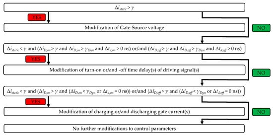 The current signals are first received by the digital controller, which then compares them. The digital controller calculates the levels and polarity of static and dynamic imbalance. Based on the polarity of each imbalance, the controller starts to modify the control parameters of the correct power device, limiting the three imbalances and following automatically a specific order, as illustrated in Figure 12. When static current imbalance (Δistatic) is greater than γ, the controller only increases the VCC of the paralleled device conducted by the least current (iD,st,low) during this stage, limiting static current imbalance, as shown in Equation (9). After a certain point (VCC,max), the controller ceases to increase VCC any further to avoid any damage to the power device. In case the static imbalance remains, the controller continues to suppress Δistatic by decreasing the VCC of the paralleled device carrying the highest current during this stage (iD,st,high), as shown in Equation (10).