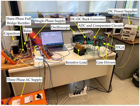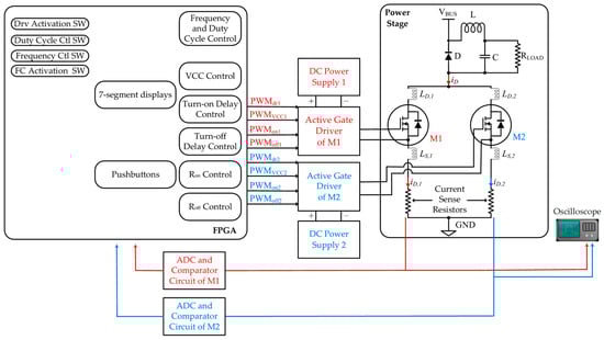 - Current sensors, ADCs, and comparator circuits: For every paralleled power device, a current sensor of high bandwidth and accuracy is utilized, measuring the drain currents during the conduction stage and transients. Every drain current is measured with a shunt resistor. Then, the developed voltage across the shunt resistor is digitalized with an ADC of high sampling capability. Also, a comparator circuit is used to capture the time delays during the turn-on and -off intervals of every current.