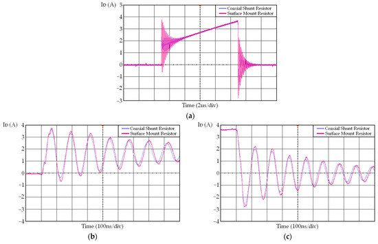 Additionally, SiC MOSFET’s drain current (iD) reaches its maximum during the turn-on interval, just before VDS begins to decrease [16]. In this case, SiC MOSFET is currently in a saturation state, and its current is expressed by Equation (2).