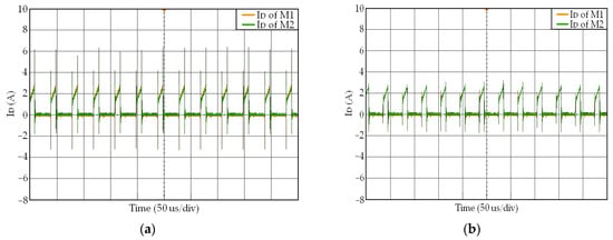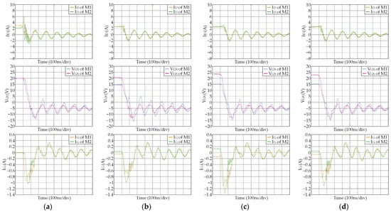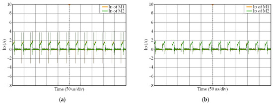 Once the algorithm has already stored a combination of all the control parameter variations, the ignition of the power application starts, applying the stored modifications to the control parameters. To validate the effectiveness of that ability, the DC–DC power converter utilizes the parallel-connected SiC MOSFETs of the first experimental test. The power converter is initiated under a VDS of 50 V, 100 V, 150 V, and 200 V, controlling VBUS, with and without the use of a stored combination of modifications, because the current imbalance is influenced as drain current changes. The purpose of the experimental tests is to compare the current deviation before and after a combination of stored modifications is implemented. Figure 24a, Figure 25a, Figure 26a and Figure 27a depict the current sharing among SiC MOSFETs where the controller tends to suppress the current imbalance without applying any stored combination. On the other hand, Figure 24b, Figure 25b, Figure 26b and Figure 27b illustrate the current deviation between SiC MOSFETs where a stored combination is implemented.