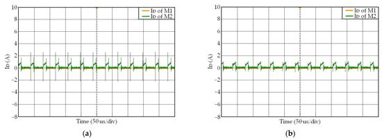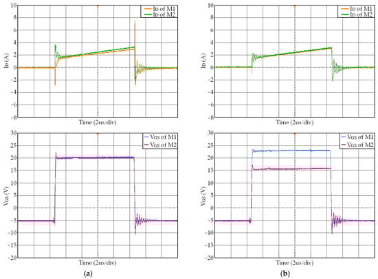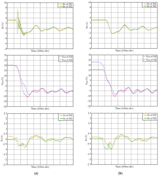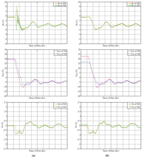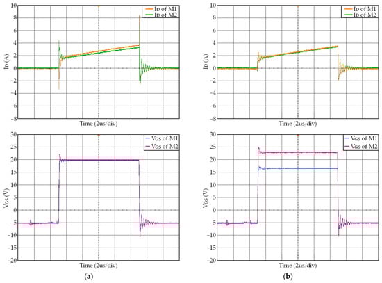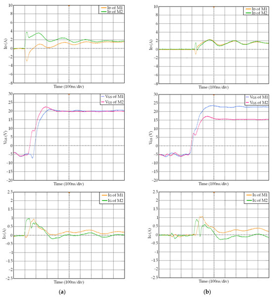 In Equation (8), it is obvious that VGS difference (ΔVGS) affects transient current deviation because iD is influenced by VGS variations even during transient intervals. On the other hand, the effect of ΔVGS is not common for every current imbalance type. Therefore, the elimination of all current imbalances can be achieved by applying individual adjustments upon VGS for the conduction stage and transients.