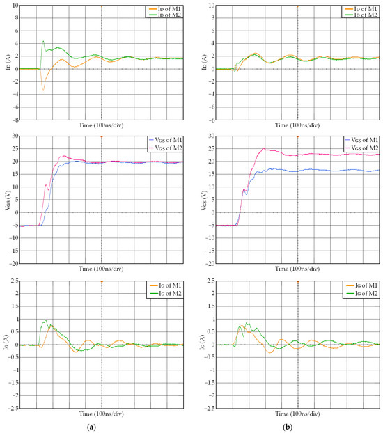 According to Equation (3), iG,i that charges and discharges CGS,i is influenced by RG,i, affecting power switch transient behavior. In this way, controlling gate current by modifying RG,i can balance the parallel currents during transients, tending to synchronize diD/dt, td(on), and td(off) of power devices.