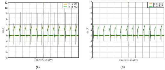 Static and/or dynamic current imbalances have also been addressed by incorporating additional elements into power and/or control circuitry. In the methods described in [11,17], dynamic imbalance was eliminated by varying control voltages of SiC MOSFETs during turn-on and turn-off intervals, with the incorporation of externally coupled inductance and same-size gate resistors. Similarly, the solution in [18] minimized only turn-on imbalance by adding gate resistors of different magnitudes and differentiating impedance between gate loops. The solution in [19] suppressed turn-on imbalance by delaying the charging of the input capacitance (Ciss) of the SiC MOSFET with the lowest Vth through an increase in its gate resistor. The solution in [20] proposed a mitigation technique for the circulating current by adding extra impedances to the drive circuit. By connecting external resistors of the same size in series with the drains of the paralleled SiC MOSFETs, the techniques described in [8,21] reduced only static imbalance. Moreover, the entire imbalance was mitigated using a differential mode choke [8]. The solutions in [22,23] connected coupled inductors in series with the drains of the power switches to eliminate both static and dynamic imbalances. On the other hand, a modified approach to applying these two techniques—balancing the parallel currents while overcoming issues caused by the coupled inductor—was proposed by [24]. Finally, [25] used a series-connected planar transformer with the drains of SiC MOSFETs to suppress the whole imbalance.