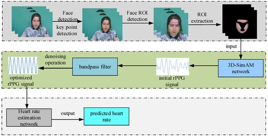 Figure 2 depicts the overall block diagram of the proposed model. It is primarily composed of three stages: face detection and ROI extraction, rPPG signal extraction and denoising, and heart rate estimation. In the first stage, Multi-Task Cascaded Convolutional Networks (MTCNN) [] are used to quickly screen possible face regions from face videos, and then Dlib [] is used to further accurately locate faces and obtain key information. The appropriate facial ROI region based on the obtained key points is manually cropped out. In the second stage, the cropped facial ROI was sent into the 3D-SimAM network model to extract the initial rPPG signal. Since the rPPG signal extracted initially contains significant noise, in order to enhance the signal quality, the initial signal is denoised by a bandpass filter, which cuts off at a frequency of [0.6, 4] Hz. In the third stage, the optimized rPPG signal is input into the heart rate estimation network to predict the heart rate value.