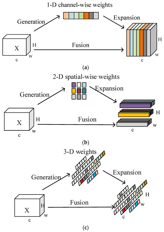 Comparison of different attention mechanisms. (a) Channel attention structure diagram; (b) spatial attention structure diagram; (c) SimAM attention mechanism structure diagram.
