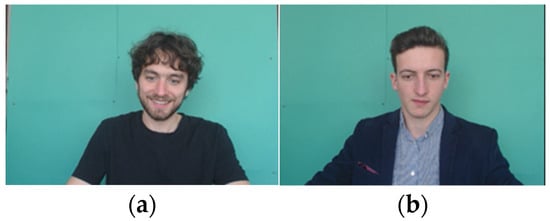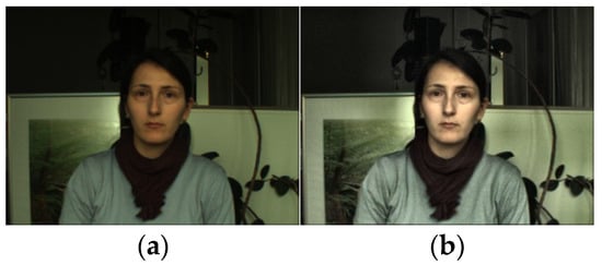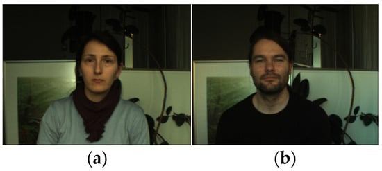 The UBFC-rPPG dataset [] recorded videos of 42 individuals in real environments, using a low-cost webcam (Logitech C920 HD Pro), each of which was about 2 min long, with a sampling rate of 30 fps and a resolution of 640 × 480. The subjects sat about 1 m away from the imaging device and were required to play digital games to induce changes in heart rate. Physiological data were collected by a CMS50E fingertip pulse oximeter while recording videos, with the collected signals including pulse waves and blood oxygen saturation. All experiments were performed indoors under varying lighting conditions, such as sunlight and different intensities of indoor lighting. A portion of the dataset is illustrated in Figure 7.