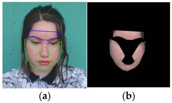 The facial ROI is used to identify key areas in facial images or videos, and is a core step in extracting heart rate signals. By precisely selecting and extracting the facial ROI, noise interference can be effectively reduced, improving the accuracy and stability of the heart rate signal. Proper ROI selection and extraction are crucial steps for the success of non-contact heart rate detection. Drawing inspiration from the ROI used in CVD, this paper employs a manual method to select facial ROIs that contain rich information. Specifically, the face is divided into two regions using the Dlib 68-point facial landmark detection technique. Region 1 is the forehead, defined by landmarks 18–27 and extended upwards by 50 pixels. Region 2 is defined by sequentially connecting landmarks 1–17, 46, 36, 55–60, 49, 32, 37, and landmark 1, covering the lower half of the face. The combination of these two regions forms the final ROI used for rPPG signal extraction, covering multiple areas of the face that reflect blood perfusion fluctuations while avoiding areas like the eyes, mouth, and eyebrows that are prone to noise. This significantly enhances the robustness and accuracy of signal extraction. The specific ROI regions are shown in Figure 9a below. After manually selecting the facial ROI, a closing operation is applied to extract the selected facial ROI, as illustrated in Figure 9b below.