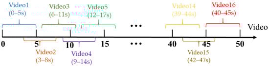 In order to help the model better capture temporal information and context, we introduced the Sliding Window Strategy for data augmentation. The sliding window strategy is widely used in time-series data, especially for video or audio. This strategy extracts multiple subsequences from the original sequence by sliding a window along the time axis with a fixed or variable step size, thus generating more training samples. Specifically, for the UBFC and PURE datasets, the first 50 s of each video are taken, and each video is downsampled to 30 frames per second to be suitable for the model in this paper. The sliding window strategy is then applied to crop the facial video (with a window length of 5 s and a time step of 3 s) to generate a new augmented video sample dataset. For example, for a 50-s video in the first dataset, the first sample dataset will be from 0–5 s, the second sample dataset will be from 3–8 s, and so on. Each adjacent sample dataset overlaps by 2 s, which helps the model better understand the relationships between adjacent time windows. In this way, 16 sub-videos can be obtained from one video, greatly expanding the dataset. The specific cropping method is shown in Figure 11.