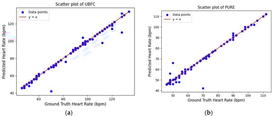 In addition, to better visualize the effect of the model used in this study, Figure 14 shows the scatter plots of predicted and true heart rates generated in the UBFC and PURE datasets. The horizontal axis represents the true heart rate value, the vertical axis represents the predicted heart rate value, and the red line y = x represents the position where the predicted value is equal to the true value. The closer the sample point is to y = x, the better the prediction effect is.