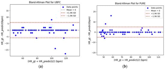 Figure 15 shows the Bland–Altman plots of predicted and true heart rate generated in the UBFC dataset and PURE dataset. For the UBFC dataset, the confidence interval shown in the Bland–Altman plot is [−4.8, 5.1], and the confidence interval shown in the PURE dataset is [−7, 6.8], both in a small range, and most of the points are within the confidence interval. Therefore, it is proved that the proposed model can retain good predictive performance in the face of different datasets, and the error is controlled at a low level, ensuring the reliability and practicability of the prediction results.