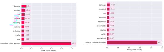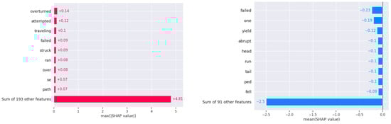 - Interpretability with SHAPThe inclusion of SHAP (Shapley Additive Explanations) provides transparency into the model’s predictions, offering insights into the most influential factors driving crash severity. This interpretability ensures that complex models, like BERT/Bi-LSTM, do not function as “black boxes”, but instead provide clear explanations for decision-making processes [].