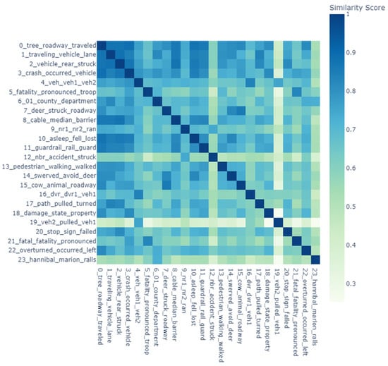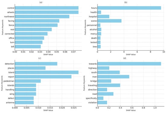 Topic modeling is an unsupervised machine learning technique aimed at identifying abstract “topics” by clustering groups of words within a set of documents. The evolution of topic modeling techniques has significantly advanced the field of NLP, beginning with the introduction of Latent Semantic Analysis (LSA) and culminating in the development of Bidirectional Encoder Representations from Transformers (BERT) []. LSA, introduced by Deerwester et al. [], marked the inception of extracting latent topics from text by decomposing term-document matrices, thereby uncovering the underlying semantic structure of the corpus. Following LSA, Blei et al. [] introduced Latent Dirichlet Allocation (LDA). This generative probabilistic model improved upon LSA by allowing documents to be represented as mixtures of multiple topics, thus providing a more flexible and detailed method for topic discovery. Despite their effectiveness, both LSA and LDA are limited by their reliance on bag-of-words representations, which ignore the order of words and the contextual nuances of language. The advent of deep learning brought about significant advancements in topic modeling, with the introduction of models that could understand the context and semantics of words in text. BERT [] represents a paradigm shift, leveraging a transformer architecture to generate deep contextualized word embeddings. Although LDA and BERT are established techniques in natural language processing, the present study distinguishes itself by applying these methods to a novel cross-cultural context in traffic safety analysis. The integration of BERT for topic modeling and text classification with the addition of SHAP for model interpretability offers a fresh perspective that enhances the understanding of crash patterns in different cultural settings. This approach applies advanced NLP techniques to a new domain and introduces a comprehensive methodology that can be adapted for broader applications in road safety research. This work, therefore, contributes meaningfully to the field by bridging the gap between methodological rigor and practical application in a critical public safety domain.