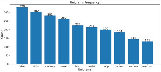 Text Normalization: Text was converted to lowercase, and non-textual characters, URLs, and commonly repeated irrelevant terms (e.g., “VEHICLE”, “KIN”, “PRONOUNCED”, “FATALITY”) were removed to reduce noise while preserving critical crash-related terms, such as “death”, “killing”, and “notified”.
