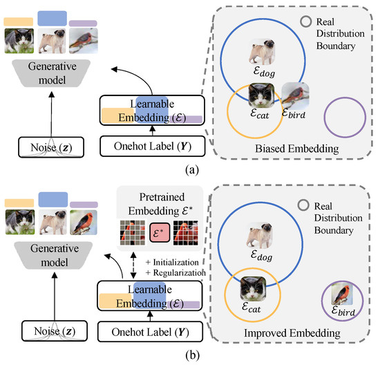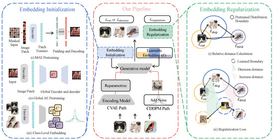 In this section, we propose a method to improve the training of the embedding layer for imbalanced CVAE and CDDPM, called Embedding Pretraining and Regularization (PREmbed). Our key idea is to initialize an unbiased embedding layer and to maintain the relative feature distance, while allowing the absolute value to change during training. In particular, we first review the basic architecture of CVAE and CDDPM and the overview of our pipeline in Section 4.1; then introduce Embedding Pretraining from Masked AutoEncoder in Section 4.2; and, finally, we present the implementation of embedding regularization during training in Section 4.3.