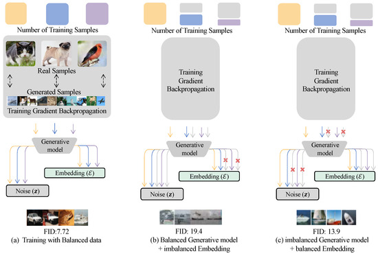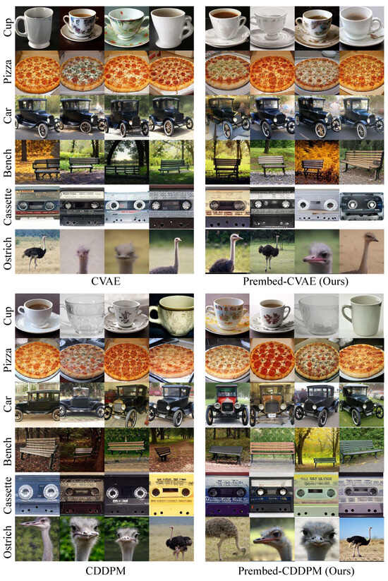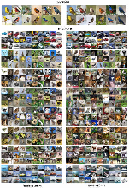 As shown in Figure 2, to investigate the cause of performance degradation in imbalanced training for CVAE and CDDPM, we conducted comprehensive experiments using the CIFAR-10 dataset [3]. CIFAR-10 is a standard benchmark for both balanced and imbalanced vision representation learning [65,66,67]. We manipulated the dataset to create both imbalanced and balanced versions, allowing for a detailed analysis of performance under different data distributions. Our baseline models were built upon the vanilla CVAE [1] and CDDPM [2] architectures, with reweighted data sampling to mitigate the impact of class imbalances. This approach involved oversampling images from underrepresented classes to ensure an equitable number of samples during the training process.