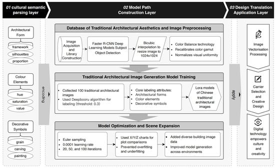 To address the limitations in controllable generation of traditional architectural images within the field of artificial intelligence, this study proposes a design transformation model based on Stable Diffusion (Figure 3). The core of this model lies in leveraging Stable Diffusion’s expansive generative capabilities while integrating techniques, such as the Lora model and the Canny model. By employing a systematic structure, the model divides the complex generation process into three layers: the cultural semantic analysis layer, the model path construction layer, and the design translation and application layer. This structure enables fine-grained control over the design of traditional architecture, ultimately achieving high-quality image generation.