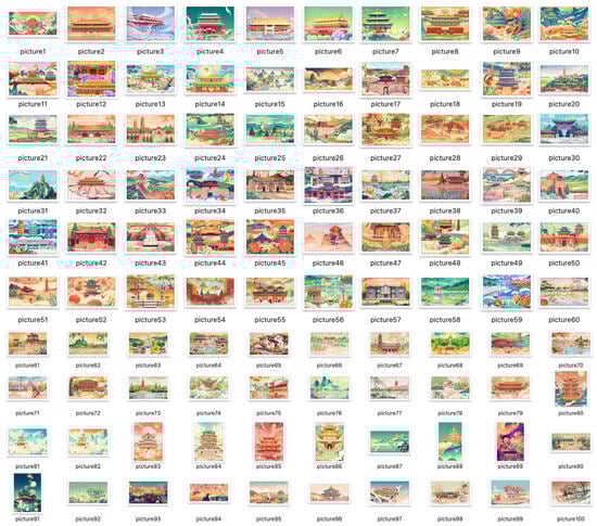 The core of image generation lies in training and optimizing the generative model. This study employs the Stable Diffusion framework, combined with a custom-trained Lora model, to enhance the quality of architectural details in generated images. The Lora model, which utilizes parameter fine-tuning within a low-rank adaptive optimization framework, strengthens the expression of cultural symbols and artistic elements during generation. The training dataset comprises 100 traditional architectural images sourced (Figure 4) from both the prior work of the research team’s studio and open-access databases. The dataset features a diverse range of traditional Chinese architectural styles, encompassing representative structures from various provinces. Key examples include the Drum and Bell Towers, the Forbidden City, the Temple of Heaven, and the Great Wall at Badaling in Beijing; the Guanque Tower and Hanging Temple in Shanxi; Jinyunli in Tianjin; the Shaolin Temple in Dengfeng, Henan; and the Ta’er Monastery in Xining. Notably, 35 of the images specifically depict traditional architecture in Beijing, reflecting the region’s architectural richness. To ensure the dataset’s diversity and relevance, it includes a mix of architectural forms, color elements, and decorative symbols representative of different historical periods and regional styles. However, the dataset exhibits a higher representation of northern architecture, particularly Beijing’s traditional structures, due to the wider availability of such references. To address this bias, future work will aim to include underrepresented styles from other regions and historical periods.