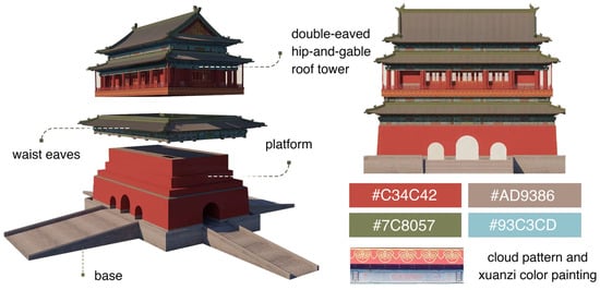 The Drum Tower in Beijing, an integral component of the Bell and Drum Tower architectural complex, serves as the subject of this study. Situated at the northern terminus of Beijing’s central axis, the Drum Tower is a core element of the World Heritage site, “Beijing Central Axis: A Masterpiece of the Ideal Capital Order in China.” The architectural form of the Drum Tower embodies the grandeur and symmetrical beauty of traditional Chinese architecture. The building is a two-story pavilion structure, with a brick-and-stone base at the lower level and a wooden structure on the upper level, exuding a sense of stability and solemnity. Its square plan, with each side measuring approximately 55 m, achieves perfect symmetry and demonstrates a high degree of geometric order. The roof adopts a double-eave hip-and-gable design with upward-curving ridges, combining features of both the hip roof and the gable roof, creating a balance between stateliness and dynamism. In terms of color elements and decorative symbols, the Drum Tower predominantly features red, symbolizing nobility and auspiciousness. The eaves are adorned with brackets and polychrome paintings in green, blue, and gold, representing vitality, vastness, and sanctity. The decorative motifs on the brackets include auspicious patterns such as dragons, phoenixes, and cloud designs, showcasing profound cultural symbolism and artistic expression. At the top of the structure, metallic tiles and bottle-shaped ornaments symbolize peace and prosperity, further emphasizing the building’s symbolic and dignified presence (Figure 5).