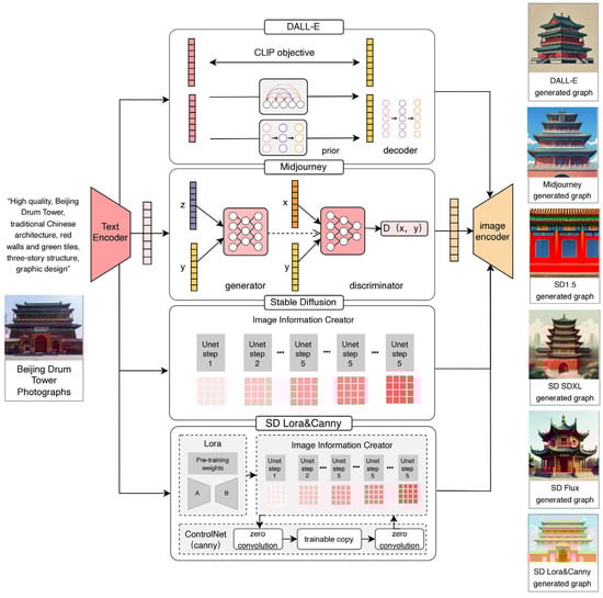 The experiment consisted of two distinct phases. The first phase focused on keyword-driven image generation, where images of the Beijing Drum Tower were generated using popular AI tools, including DALL-E, MidJourney, and various versions of Stable Diffusion (1.5, SDXL, and Flux). The proposed design transformation model for the AI-generated traditional architectural images was also employed to produce comparable outputs. Identical textual prompts were used across all the tools to ensure consistency, incorporating keywords such as “high quality”, “Beijing Drum Tower”, “traditional Chinese architecture”, “red walls and green tiles”, “three-story structure”, and “graphic design”. The objective of this phase was to evaluate the quality and stylistic consistency of the images generated by different tools under the same input conditions. The generated images were visually compared to assess the performance of each tool in processing the given textual prompts (Figure 6).