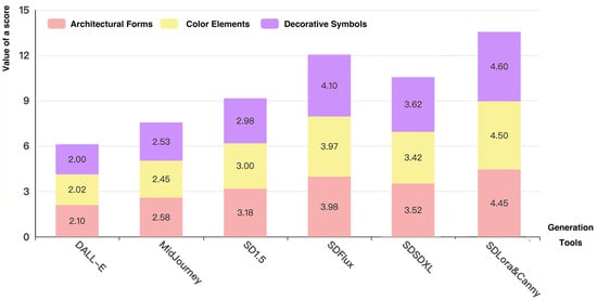 A descriptive statistical analysis was conducted to evaluate the performance of each generation tool across the three dimensions: architectural form, color elements, and decorative symbols (Table 3). The results indicate that the SD Lora&Canny model achieved significantly higher average scores across all three dimensions, scoring 4.45 in architectural form, 4.50 in color elements, and 4.60 in decorative symbols. This highlights its exceptional precision and detail reproduction in image generation (Figure 7). Following closely was the SD Flux model, with average scores of 3.98, 3.97, and 4.10 in architectural form, color elements, and decorative symbols, respectively, demonstrating its ability to achieve a reasonable degree of fidelity in traditional architectural image generation. In contrast, DALL-E, MidJourney, and SD 1.5 exhibited more consistent but relatively lower scores, ranging from 2.0 to 3.7. This reflects certain limitations in detail control and color accuracy among these tools.