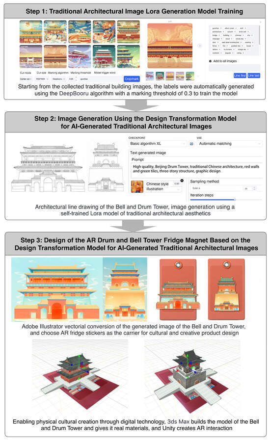 Design process of the AR Drum and Bell Tower Fridge Magnet based on the AI-generated traditional architectural image transformation model.