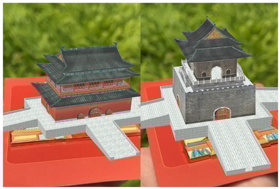 The AR Drum and Bell Tower Fridge Magnet is a digital cultural creation product that integrates AI-generated imagery with augmented reality (AR) technology (Figure 8 and Figure 9). This product draws inspiration from the Drum and Bell Towers of Beijing, two historic buildings of profound cultural and historical significance. Once serving as timekeeping landmarks and symbols of the city, these towers embody the historical memory and cultural depth of the ancient capital. The design and implementation of this product were guided by the proposed AI-generated traditional architectural image transformation model.