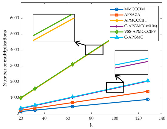 From the above table, it can be concluded that enhancing the adaptability of the algorithm to the environment may come at the cost of increased computational complexity. For example, the algorithm proposed in this paper increases the number of multiplications by 5P + 6 times and the number of additions by P + 20 times after adding the variable-step-size strategy. And after one parameter is determined, a small change in another parameter may also bring a relatively large impact on the complexity of the algorithm, so it is necessary to coordinate the relationship between the projection order of the algorithm and the filter length. In addition, the following figure visualizes the complexity comparison of the algorithms. Since all the affine projection class algorithms used in this paper have a projection order of 4 in the simulation experiments, P = 4 is set to make the length of the unknown system weight vectors k increase sequentially according to the trend of 20, 32, 64, and 128. The Figure 1 and Figure 2 of the change in the number of multiplication and addition operations of several algorithms are obtained, respectively.