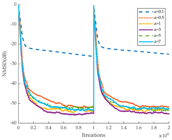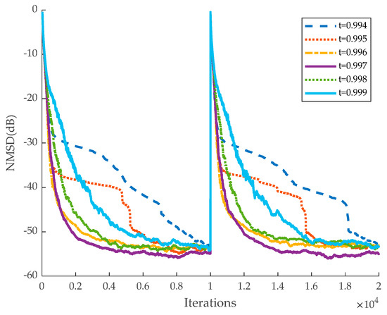 It should be noted that the parameter sensitivity analysis range of this experiment is determined based on a large number of simulation experiments, and parameter selection outside the range is likely to cause the algorithm to fail to converge properly. Therefore, in order to ensure that the algorithm can operate efficiently and stably in the real environment, the impact of parameter selection on the performance of the algorithm will be analyzed in depth within the current range. For parameter α, too large a value can lead to too much influence of the error on the algorithm, and too small a value can weaken the adaptive performance of the algorithm. For parameter β, too large a value will result in the algorithm relying too much on the sparsity of the system, and too small a value will weaken the algorithm’s ability to adapt to sparse systems. For the parameter σ, a value that is too large may hinder the algorithm’s ability to adapt to complex signal dynamics, while a value that is too small could lead to overfitting. Regarding the parameter t, an excessively large value causes the algorithm to overly depend on past data, slowing down convergence. Conversely, a value that is too small results in rapid changes in the step size, reducing the algorithm’s stability. As shown in Figure 3, when the parameter α in the matrix B(n) is within the range of (0.5, 7), the algorithm achieves faster convergence and a lower steady-state error. When α is less than 0.5, the algorithm exhibits a high steady-state error and fails to converge after 1 × 10⁴ iterations. Furthermore, when α exceeds 3, the steady-state error increases as α rises. Based on these observations, the optimal value of α for the algorithm is determined to be 3. Similarly, as shown in Figure 4, Figure 5 and Figure 6 the best parameters are identified as β = 1, σ = 0.01, and t = 0.997.
